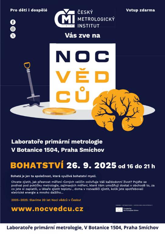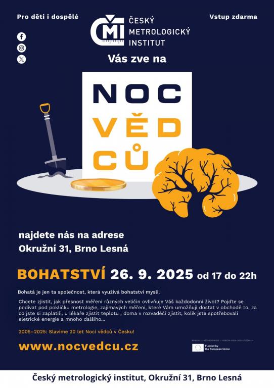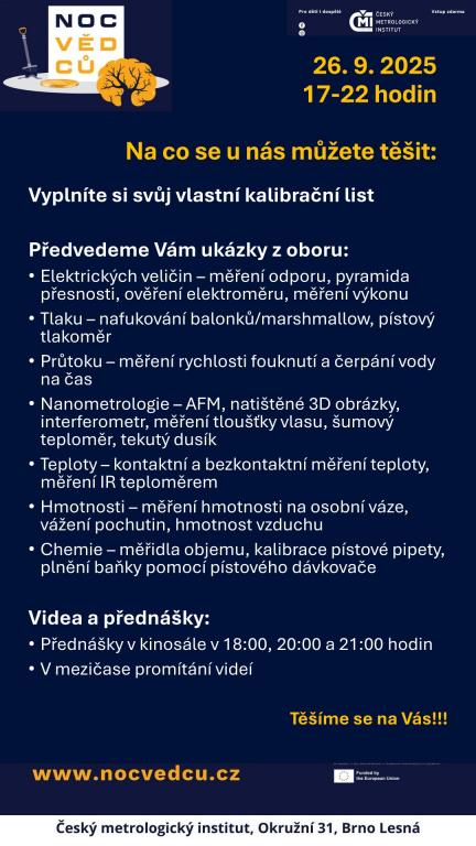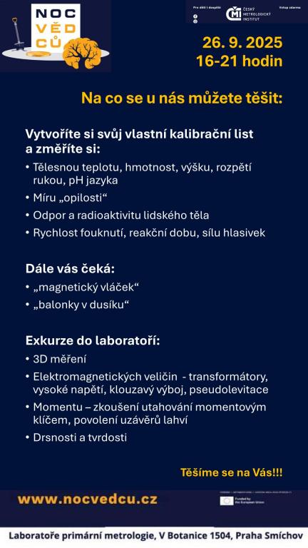Pojďte se s nám podívat pod pokličku metrologie, státní etalonáže, zajímavých měření, které Vám umožňují dostat v obchodě to, za co jste si zaplatili, u lékaře zjistit správnou a přesnou teplotu, doma v rozvaděči zjistit, kolik jste spotřebovali elektrické energie a mnoho dalšího. Vyzkoušejte si 3D mapování Vámi donesené hračky, vyrobte si vlastní sluneční hodiny, nechte si zkontrolovat Vaši váhu či teploměr, vyzkoušet jaký máte odhad na vzdálenost, hmotnost a jiné obory měření. Pro děti máme připravené soutěže a workshopy a každý návštěvník může na konci své cesty obdržet kalibrační list se svými výsledky.