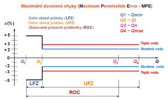 Největší dovolené chyby (označované též MPE) vodoměrů pro jejich ověřování jsou uvedeny v čl. 2.3.3 Opatření obecné povahy (OOP) č. 0111-OOP-C035-13, vydaném ČMI. Toto opatření stanovuje metrologické a technické požadavky na vodoměry a metody jejich zkoušení při ověřování (v souladu s platnou normou ČSN EN 14154-1+A). MPE jsou graficky znázorněny na Obr. 1 této webové stránky. Dovolené chyby při přezkoušení vodoměru v provozu, prováděného na základě pochybností o správnosti měřidla jako ověření podle § 11 odst. 4 zákona o metrologii, jsou podle OOP rovny dvojnásobku chyb dovolených pro ověření, resp. posouzení shody při uvádění vodoměrů na trh (tzv. MPES - z anglického max. dovolené chyby v provozu).